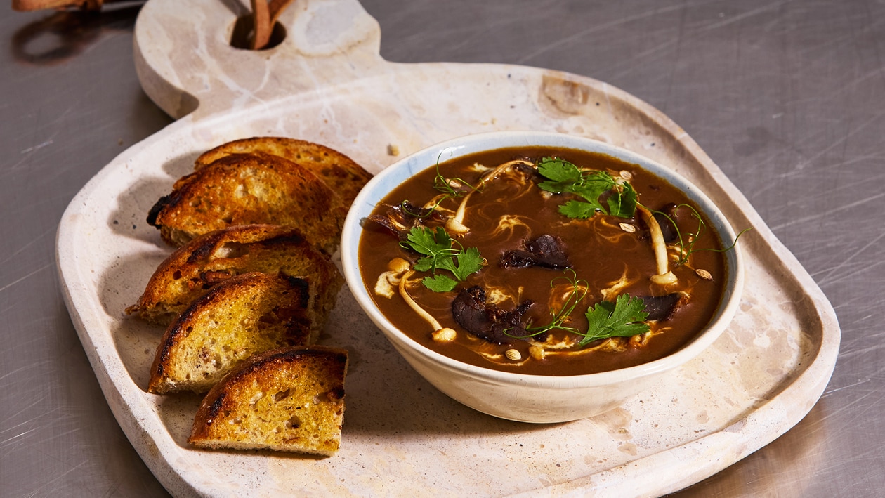 Bold, comforting flavours come together in this hearty soup inspired by familiar local ingredients. Spicy biltong adds deep savoury richness, while fresh coriander brings a bright, aromatic lift. The result is a warming dish that balances intensity and freshness, delivering a satisfying bowl full of character.