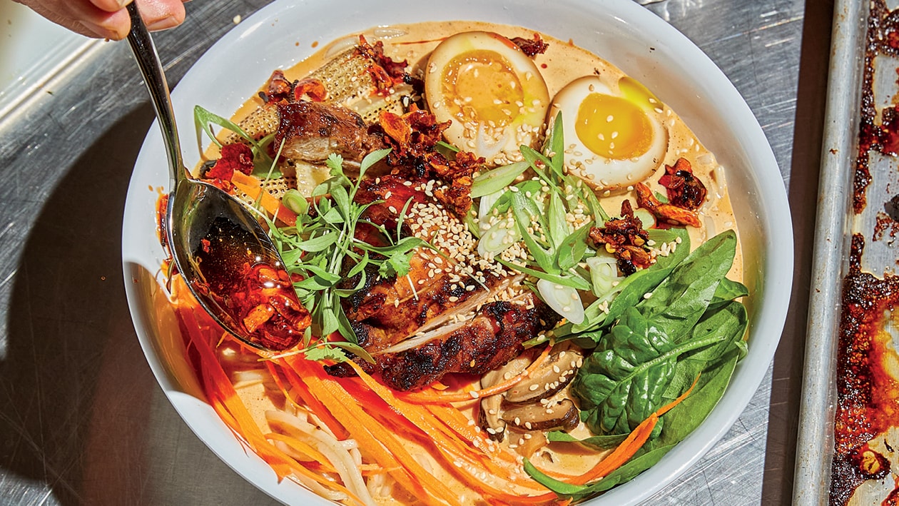 Ramen with a twist – and a kick. A smoky mackerel and roasted chicken broth meets silky mayo for rich depth. Char siu chicken, ramen eggs, crisp veg, and crispy chili oil top off this fiery bowl. Spicy, creamy, and fully loaded with texture.