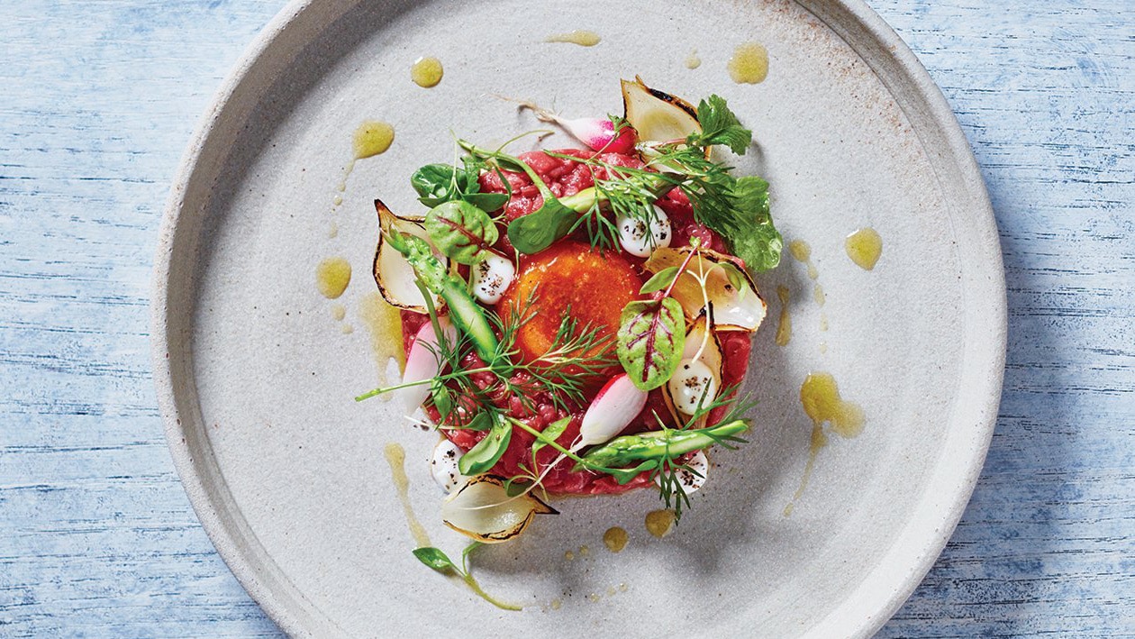 3. Use a round cutter to form the steak tartare stack. Place an egg yolk in the centre. Garnish with the sauteed baby pickled onions, asparagus, radishes, dill sprigs, mini gherkins, capers and micro herbs.