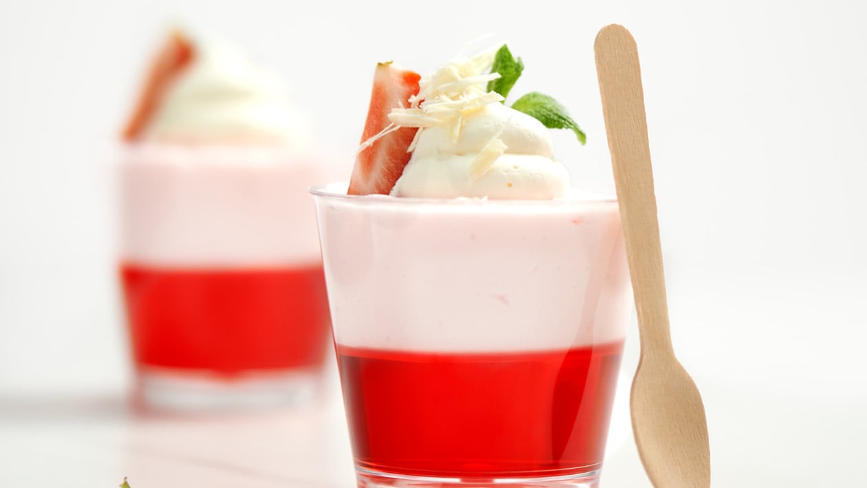 This fluffy, fruity jelly is a very berry explosion of flavour! Carte D’Or Strawberry Jelly topped with Carte D’Or Strawberry Instant Dessert and garnished with whipped cream, sliced strawberries, white chocolate shavings and a mint leaf.