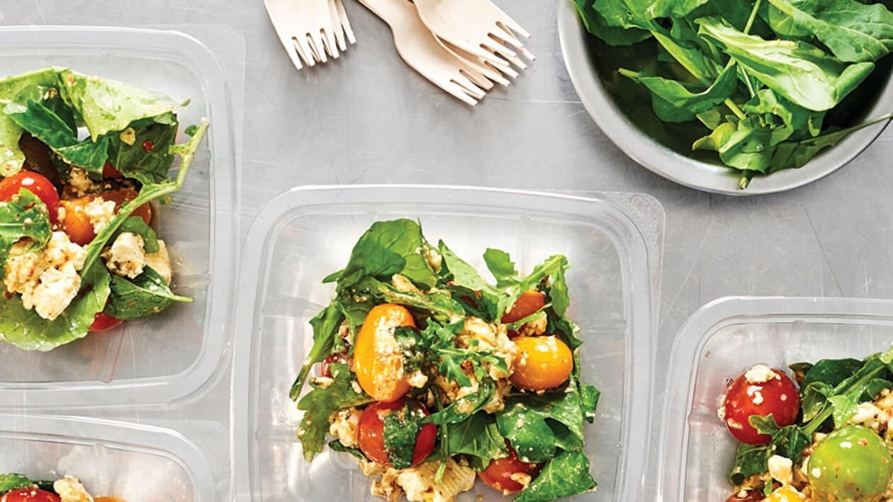 • Add rocket, Greek salad dressing and toss together and garnish with basil.