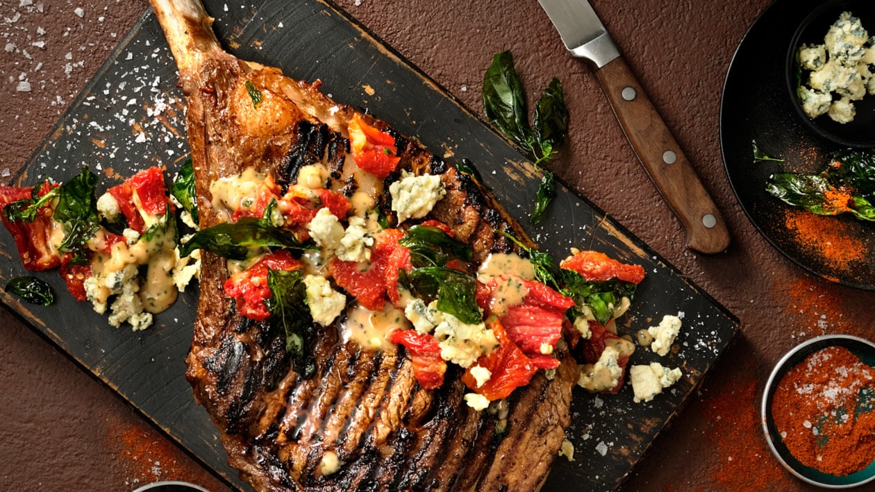 Herb-crusted, juicy tomahawk steak topped with tangy sun-dried tomatoes and rich, creamy blue cheese, and garnished with deep-fried basil for an indulgent blend of flavours and textures.