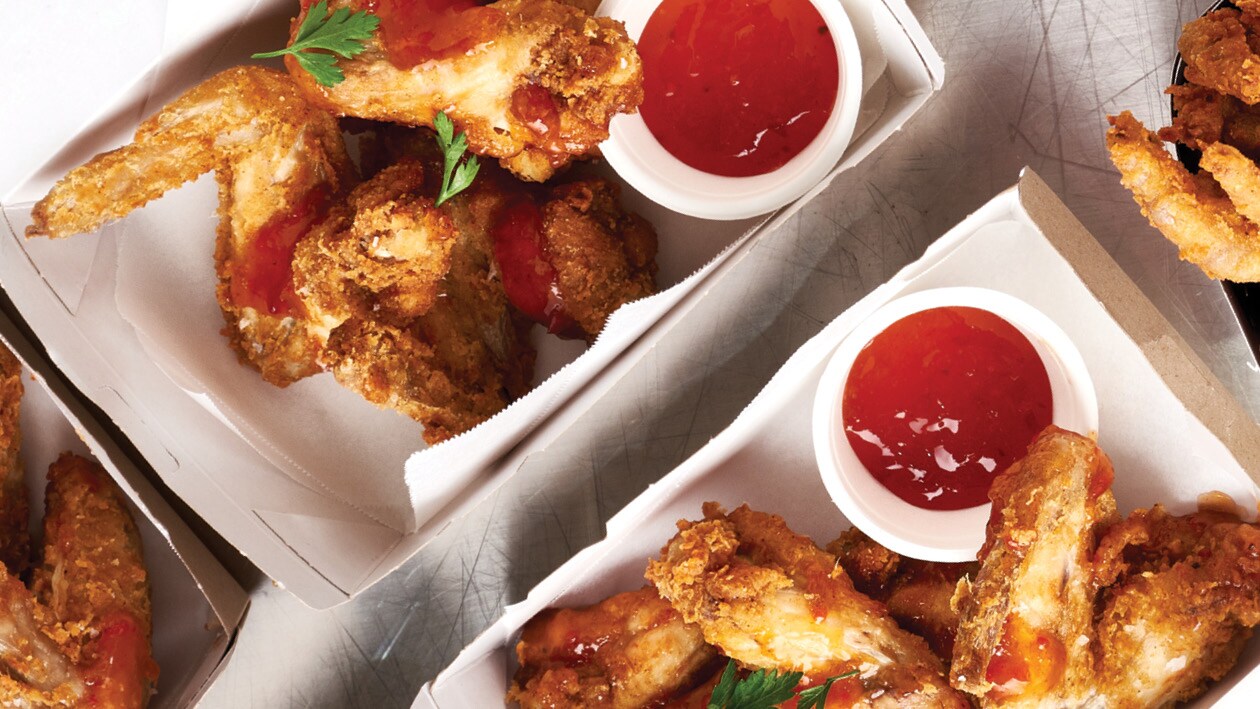 Crispy, golden, deep-fried chicken wings coated with Knorr Professional Chicken Breading for a golden colour and tossed in Knorr Professional Sweet Chilli Sauce for a hint of heat and added sweetness. Serve them as is or in a wrap or salad!