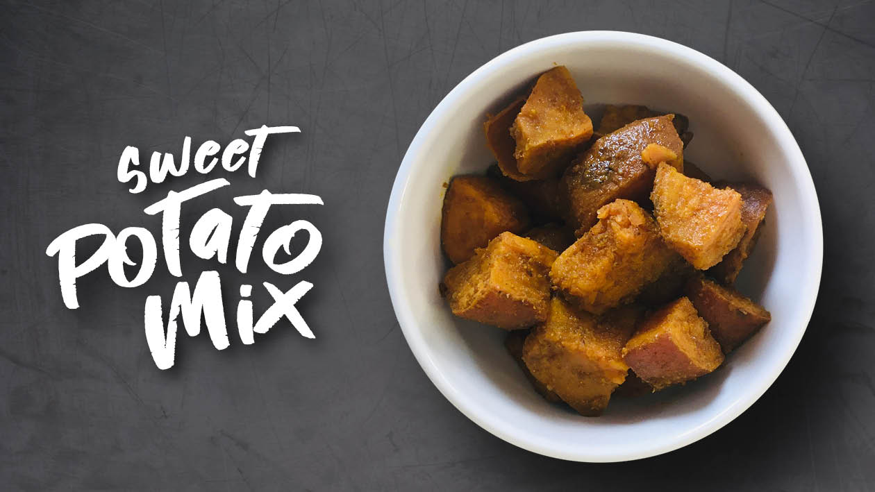 • Add sweet potatoes, Rajah medium curry, Chip & potato seasoning and drizzle with oil.