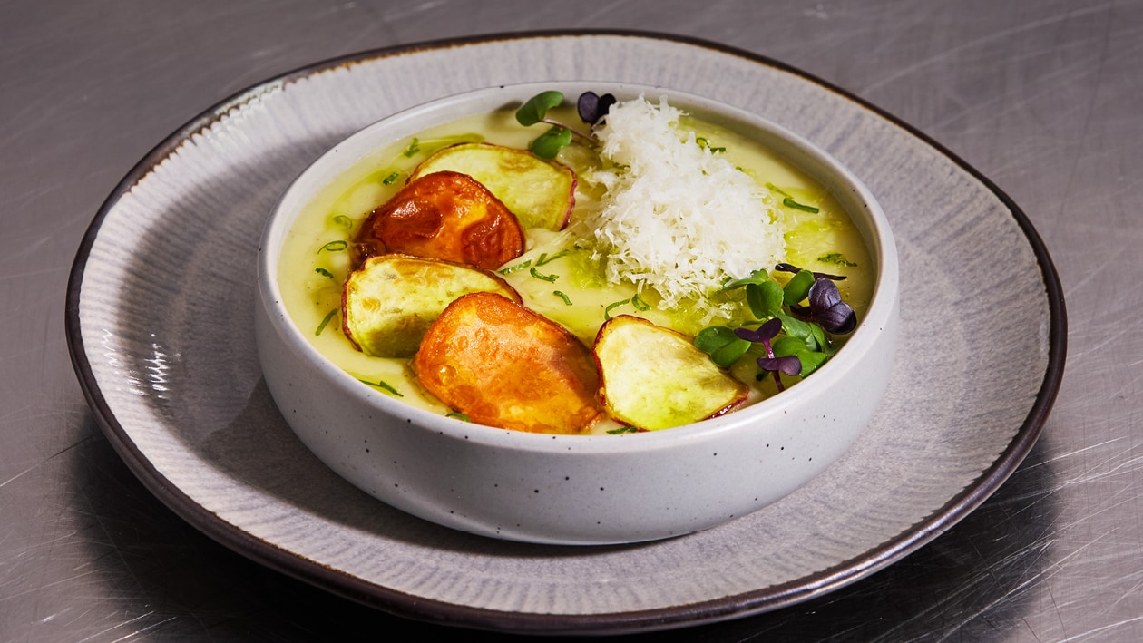 Velvety sweet potato forms the base of this comforting soup, offering natural sweetness and a smooth, creamy texture. Finished with a fragrant cheese and chive oil, the dish gains a savoury richness and aromatic lift. The result is a balanced bowl that brings warmth, depth and a touch of indulgence to a familiar favourite.