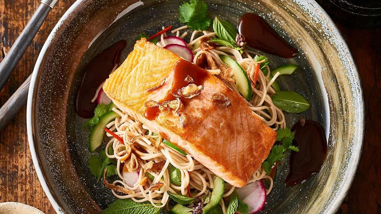1. Cook noodles following on pack instructions and allow to cool. Combine the cucumber, radish, mint leaf's, Thai basil leaf's, sesame oil and coriander Leafs and half of the Teriyaki sauce, reserving some to pour over the salmon.