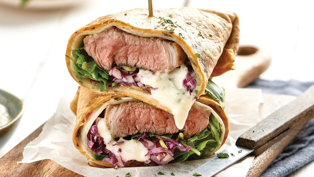 • Spread the desired amount of raita on the base of the wrap, layer with cucumber strips, grilled rump, red cabbage, red onion, and rocket leaves.