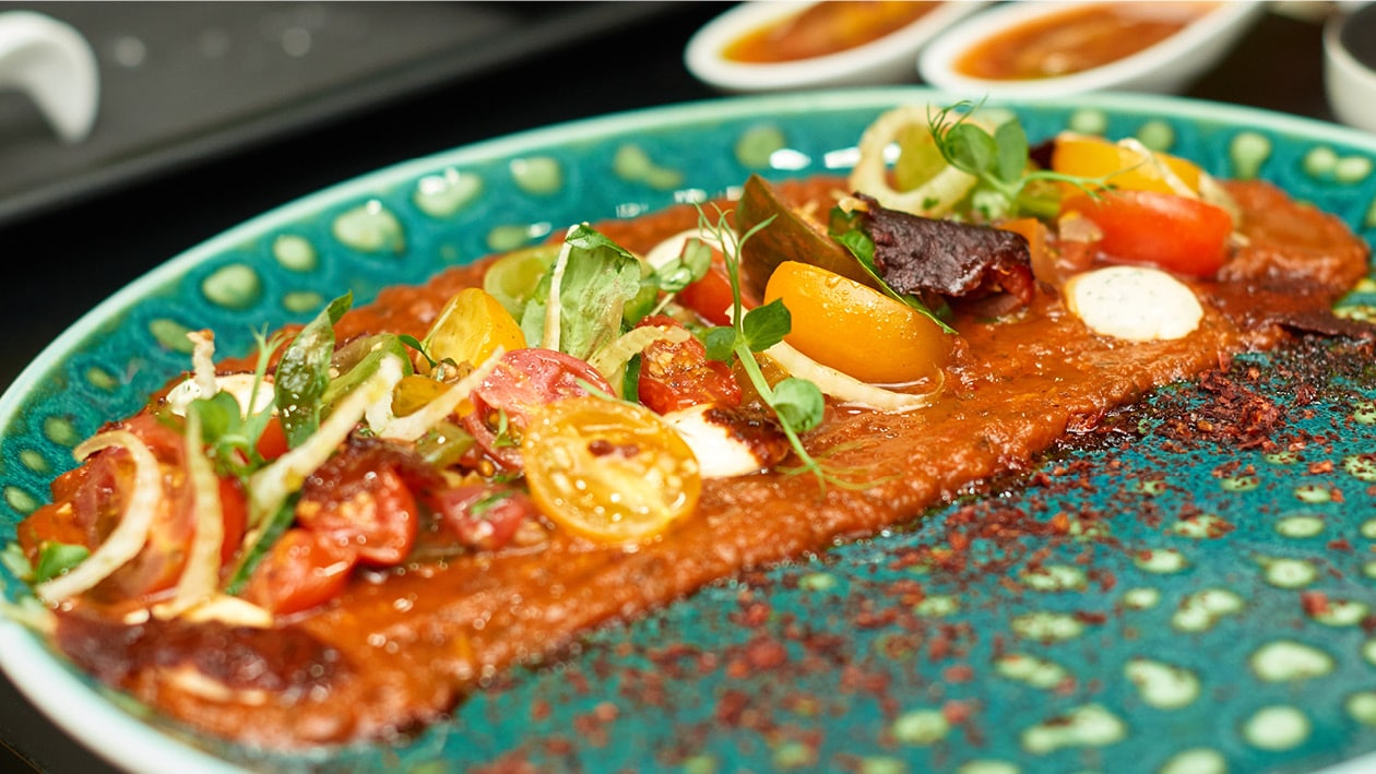 Make tomatoes exciting with a celebration of vibrant and fresh flavours! Rainbow tomatoes, dehydrated tomato, tomato ash and tomato velouté add a savoury depth and richness to this dish.