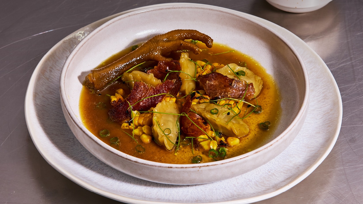Umleqwa, the traditional free-range chicken prized for its deep flavour, forms the heart of this comforting broth. Slow-simmered to draw out its rich character, the dish is paired with tender stuffed dumplings and crisp crackling that add texture and depth. Rooted in time-honoured cooking traditions, it celebrates the simplicity and warmth of heritage ingredients prepared with care.
