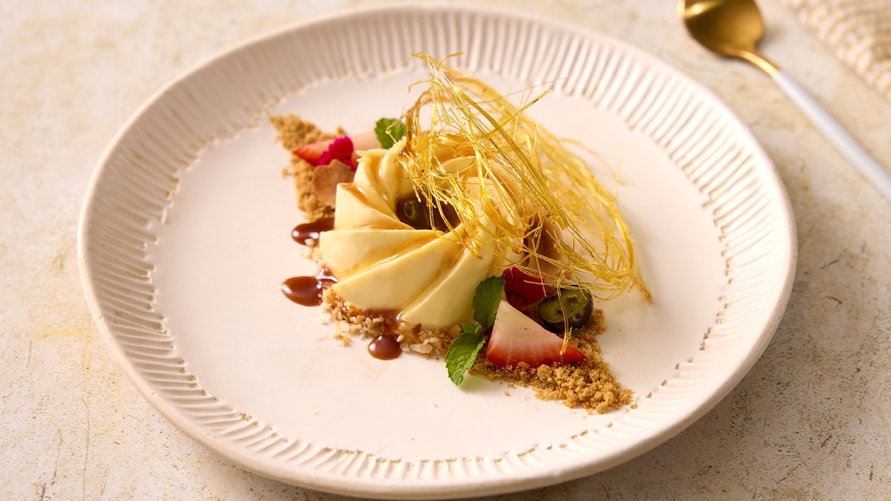 1. Unmould set crème Brulée and place directly onto the center of the plate. Add caramel biscuit crumbs, fresh strawberries, baby mint, blueberries. Pour caramel sauce over the top of the crème brulée and allow it to drip down. Finish off with angel hair.