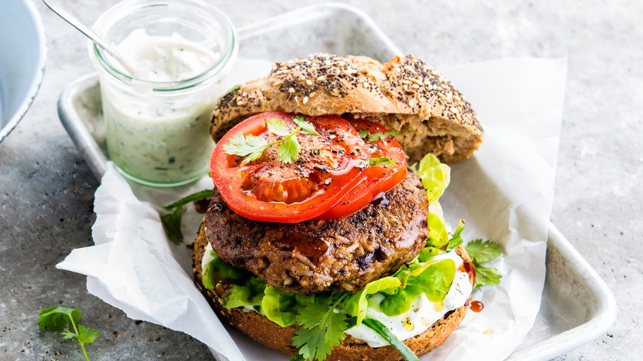 A flavour-packed vegan patty made from brown rice, toasted walnuts, and panko breadcrumbs served on a bun and topped with a traditional burger sauce.