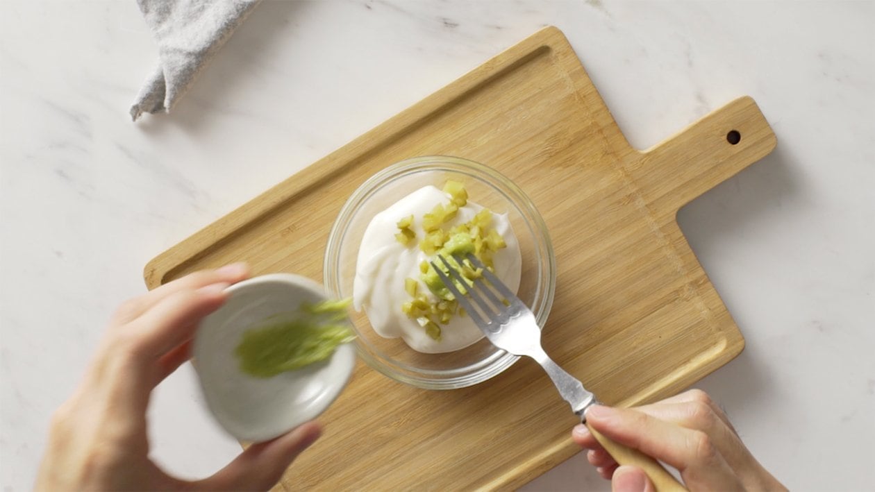 • Add 100g Hellmann's original mayonnaise, 3g wasabi paste, 10g pickled gherkins in the blender jug and blend together until well combined.